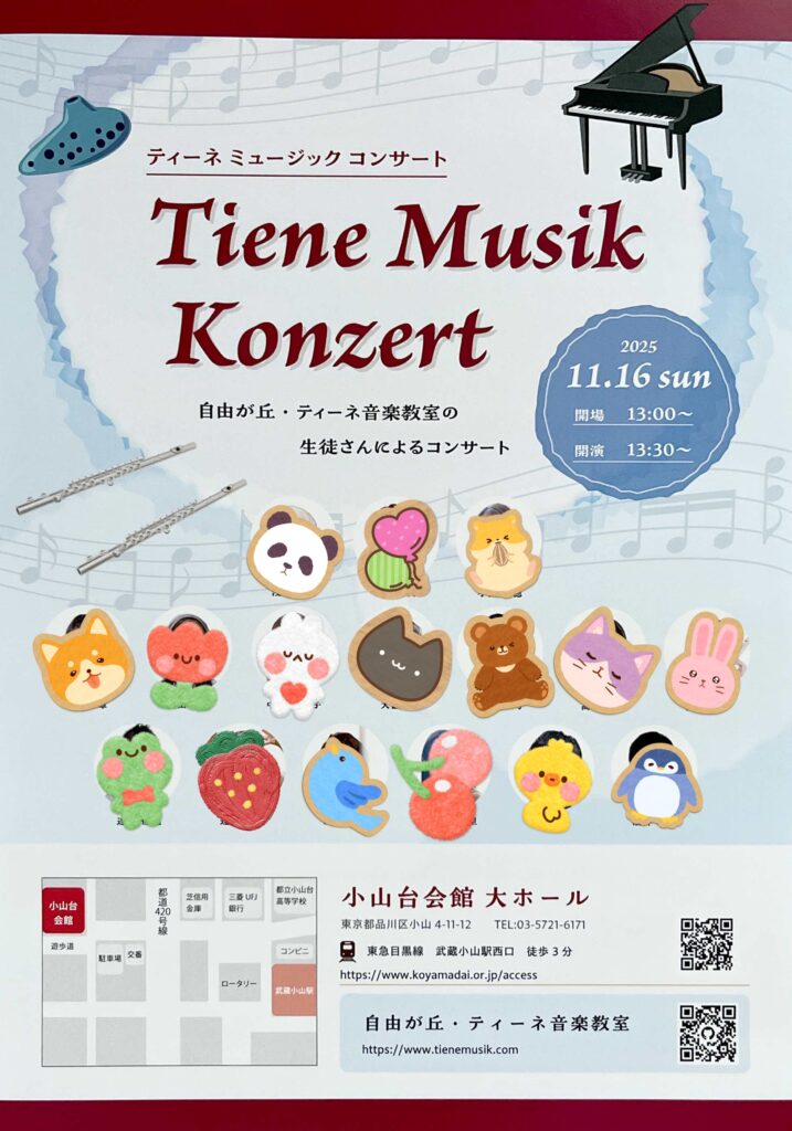 11/16(日)コンサートのお知らせ♪ ティーネ音楽教室の生徒さんによるコンサートまで、いよいよ1週間を切りました! 入場は無料です。 ご来場をご希望の方は、[お問い合わせ]よりメッセージをお送りください。 皆さんの演奏が輝く、素敵なコンサートになりますように😊✨ 日程:2025年11月16日(日) 時間:開場 13:00 / 開演 13:30 会場:小山台会館 大ホール(東急目黒線「武蔵小山駅」西口より徒歩3分) 投稿日:2025.11.10